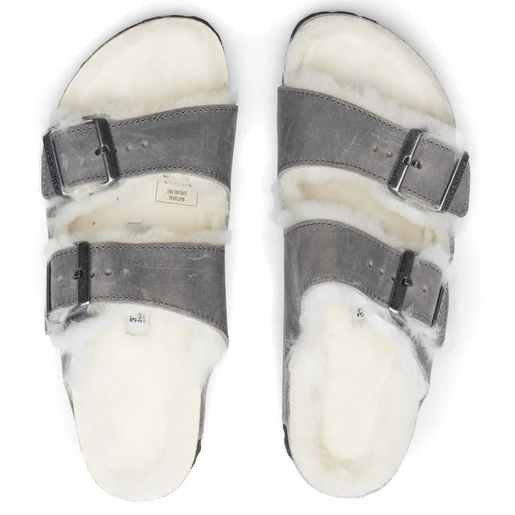 Perfect for chilly evenings, the Birkenstock Women’s Narrow Arizona Shearling features the classic anatomically-shaped cork-latex footbed along with oiled nubuck leather straps. The footbed lining comprises genuine shearling, while the two straps include adjustable metal pin buckles. The EVA outsole underneath protects the design.